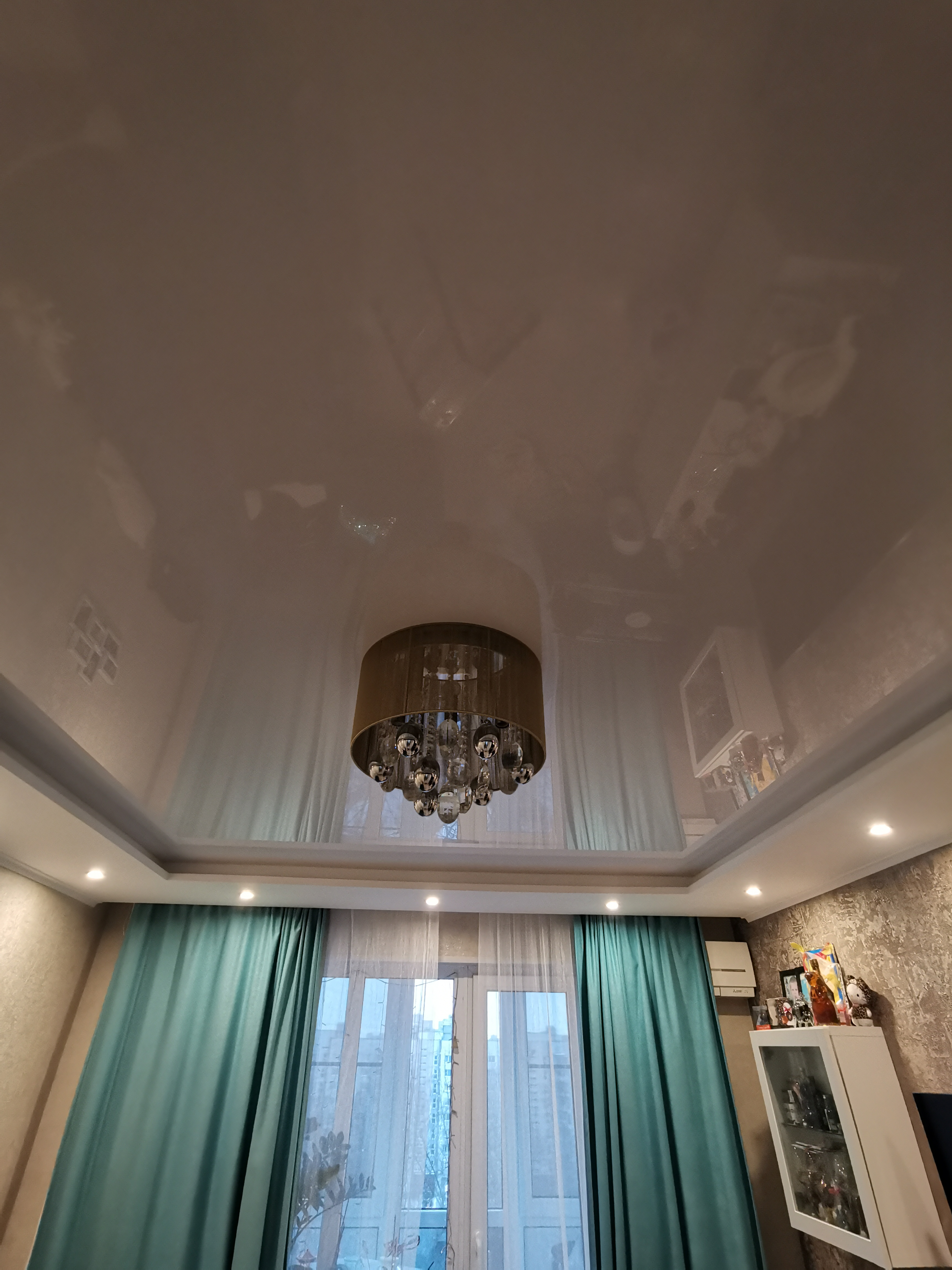 Белый глянцевый потолок — универсальное решение для любых интерьеров. Он наполняет комнату мягким светом и зрительно расширяет ее границы. При этом удается скрыть неровности и дефекты основания, улучшить шумоизоляцию и защититься от затопления сверху.