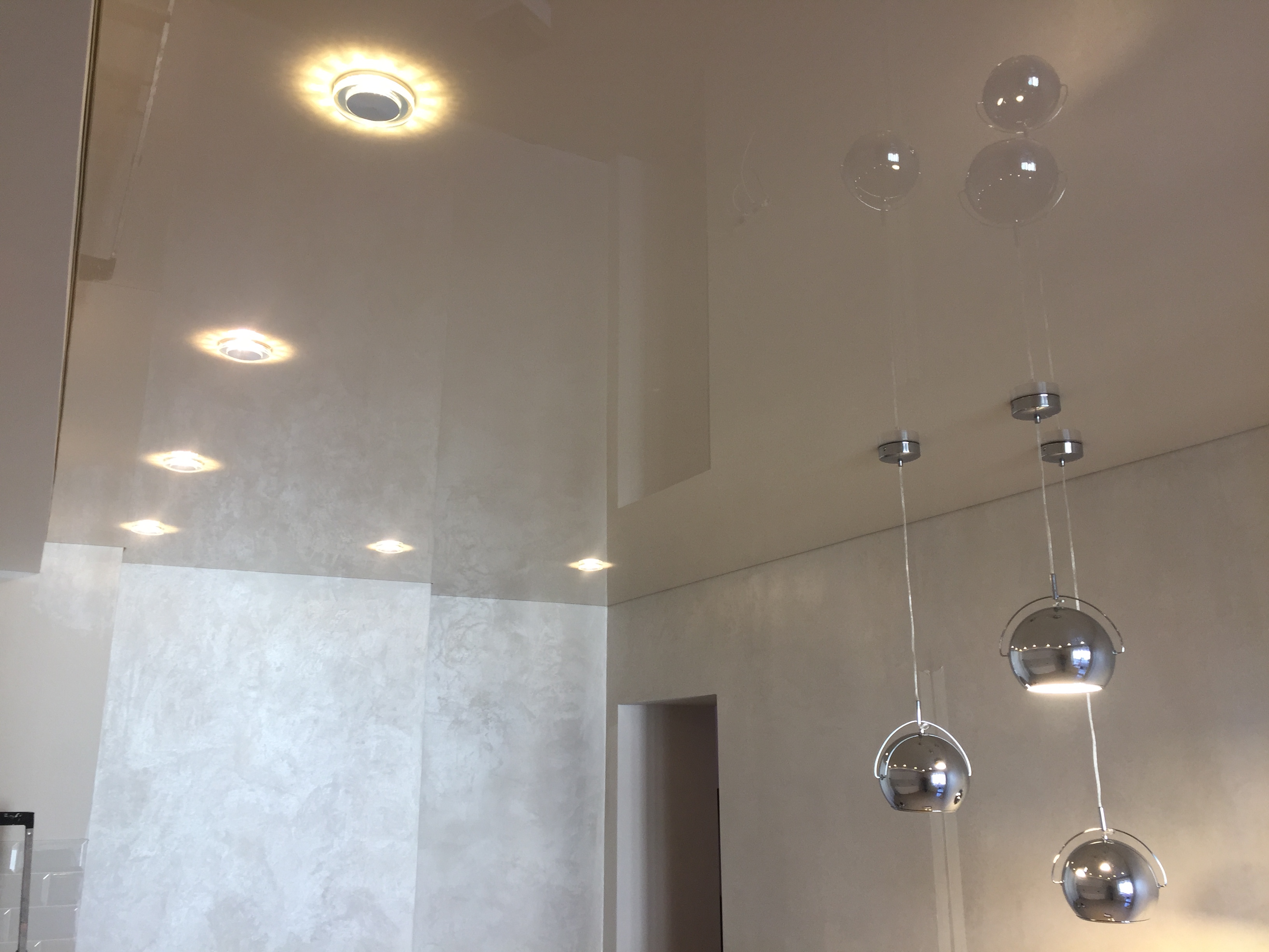 Белое глянцевое покрытие нетребовательно к цвету стен и декору интерьера. Оно гармонично вписывается в любой дизайн — от классики до лофта и хай-тека, сочетается со светлыми и темными оттенками. При желании его можно сделать как фоном, так и акцентным элементом в оформлении. Такой потолок всегда смотрится празднично и свежо, он не кажется навязчивым и не наскучивает со временем.