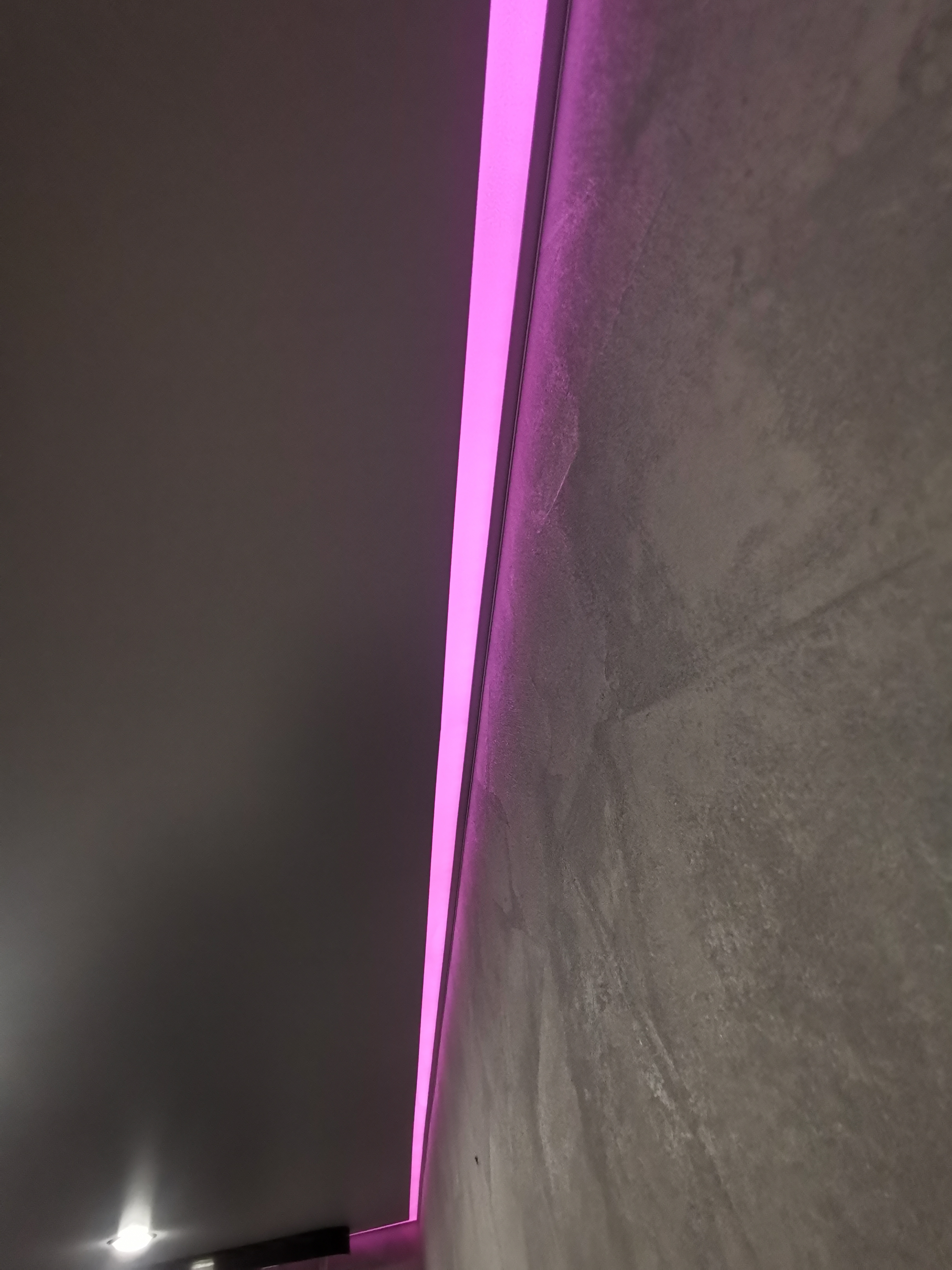Эффект контурного свечения обеспечивается за счет алюминиевого стенового профиля с дополнительной полкой. В специально оборудованную нишу вставляется светодиодная лента и закрывается ПВХ-пленкой, создающей надежную защиту от влаги и пыли. Благодаря широким боковым стенкам багета световой поток не выходит за его грани и направляется четко вниз. Точки диодов хорошо замаскированы, что позволяет добиться максимальной эстетической привлекательности.