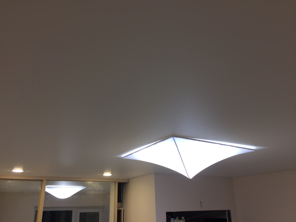 Затем необходимо замерить расстояние от полотна до основного потолка — оно пригодится, когда вы будете делать закладную для люстры.