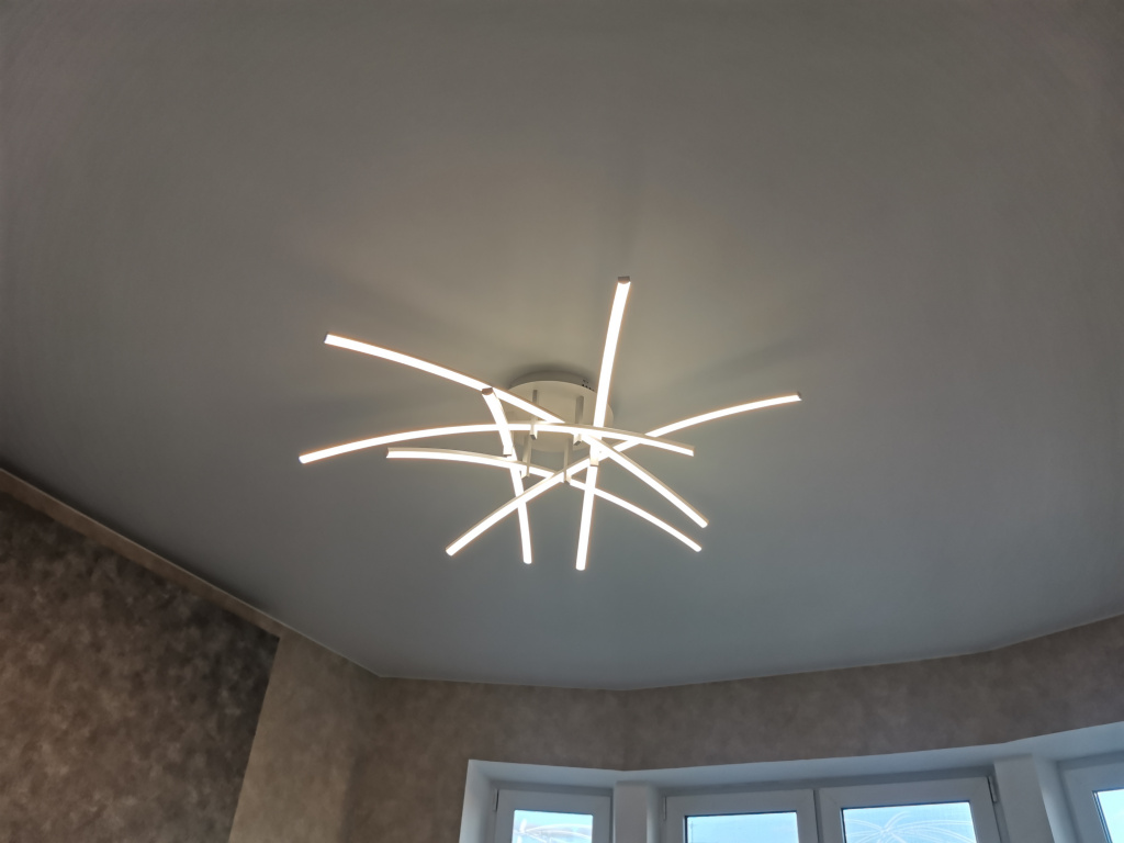 Если требуется замена люстры на натяжномпотолке, то фронт работ практически не отличается от стандартной замены — нужно разобрать существующую люстру, открутить её от крепления (обычно, это пластиковая или деревянная закладная за полотном) и разъединить провода. Отверстие в потолке надёжно защищено пластиковым кольцом, поэтому не стоит переживать, что потолок разойдётся.