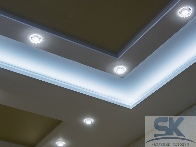 Такие конструкции имеют несколько натяжных полотен, которые монтируются на разной высоте – один уровень базовый, который закрывает большую часть площади. Остальные уровни создают неповторимый дизайн и уникальность потолка. Кроме того, многоуровневые потолки позволяют устанавливать различный свет внутри помещения – светильники монтируют в любой из уровней, сочетая их по формам и дизайну в любом порядке. Кроме того, можно установить на одном уровне люстру, а на другом светильники. Сегодня стало популярным применять светодиодную ленту, которая устанавливается между уровнями потолка для создания интересного дизайна – так подчеркивают объем конструкции.
