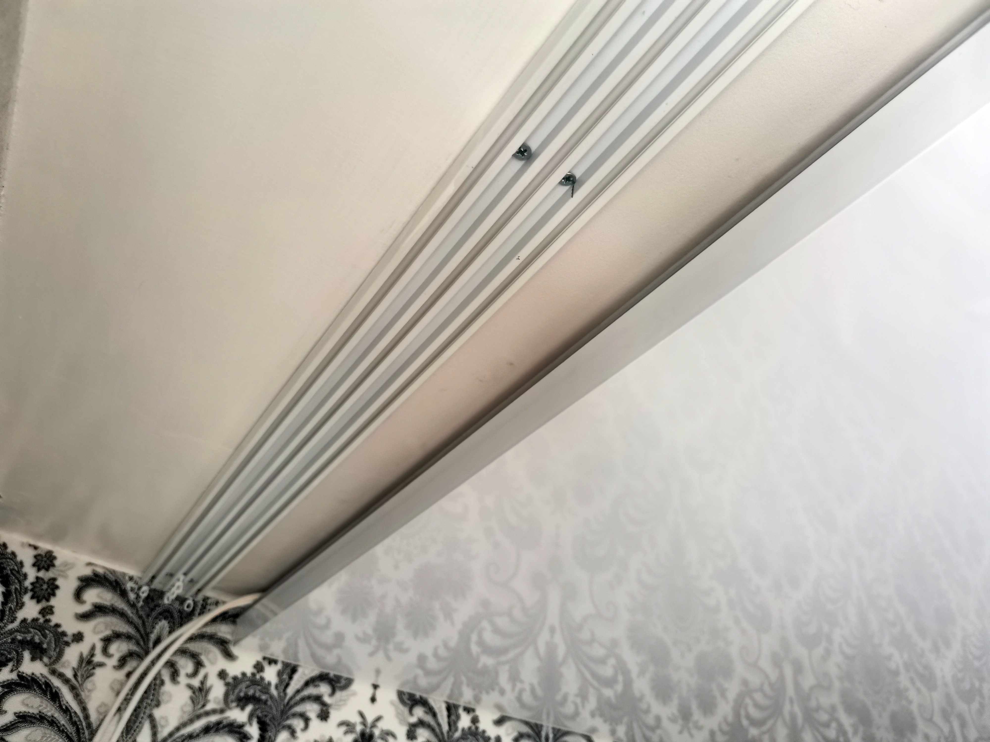 Карниз для штор может не вписываться в общую концепцию оформления интерьера или перегружать пространство. В таких случаях лучше скрыть его в потолочной нише, тем самым добившись гармонии в интерьерном дизайне. При установке натяжного потолка углубление делается с помощью специального металлического профиля БП-40. Он помогает спрятать от посторонних глаз все неприглядные детали карнизной системы – кронштейны, кольца, крючки, зажимы, двигатель электропривода. Благодаря полноценной маскировке кажется, что занавеси струятся из воздуха, а комната становится больше и объемнее.