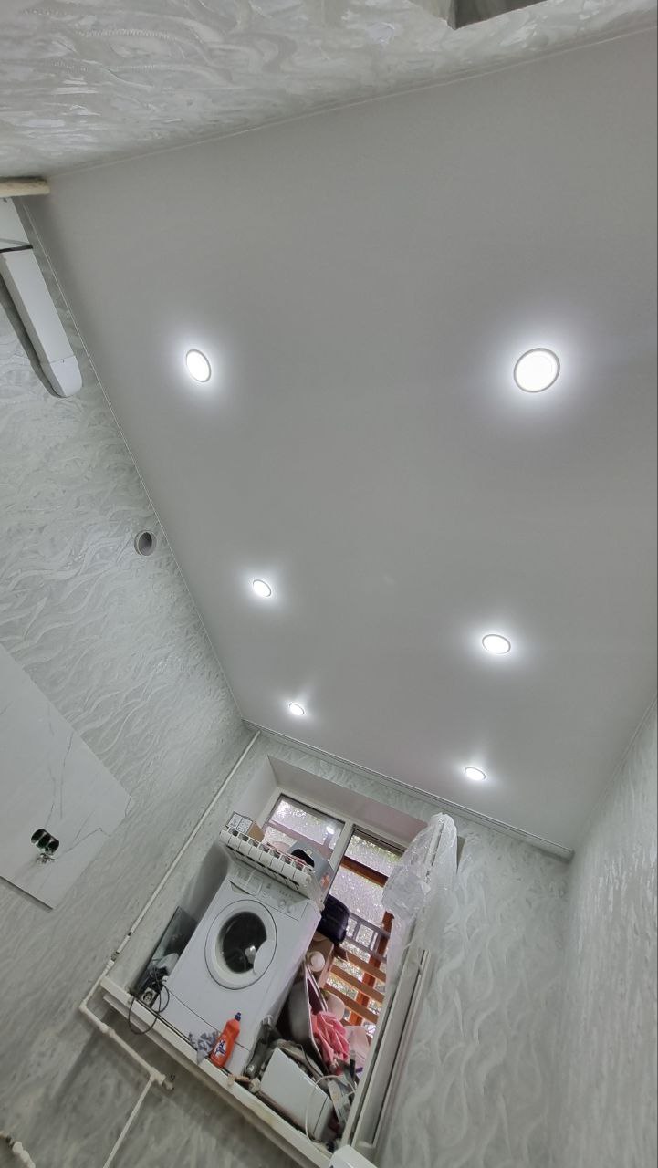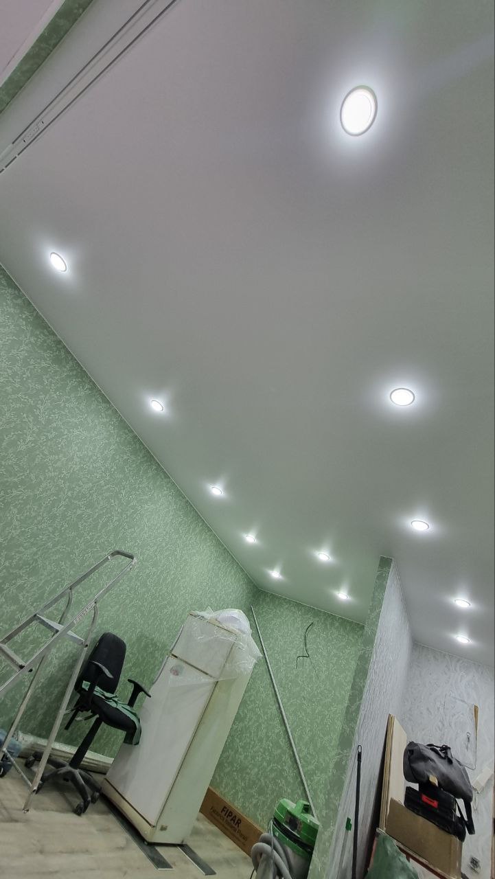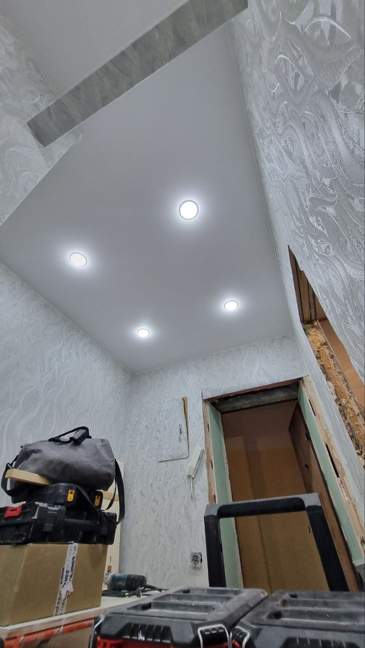 Особенность проекта — геометрия потолка в комнате и коридоре с 12 углами. Установлено 20 стильных светильников GX53 с аккуратным монтажом, обеспечивающих равномерное освещение. Плинтус белого цвета по периметру (около 35 п.м.) придаёт завершённый вид.