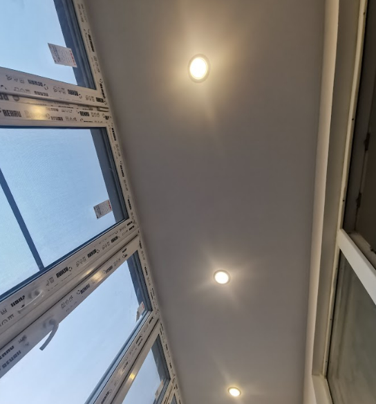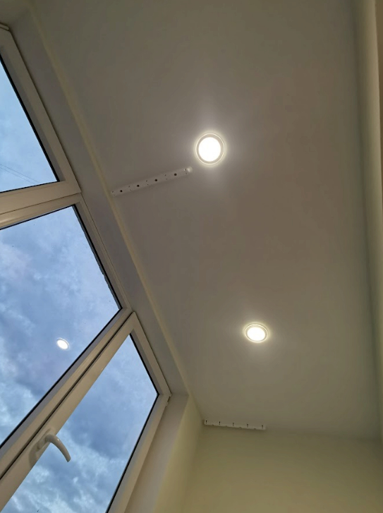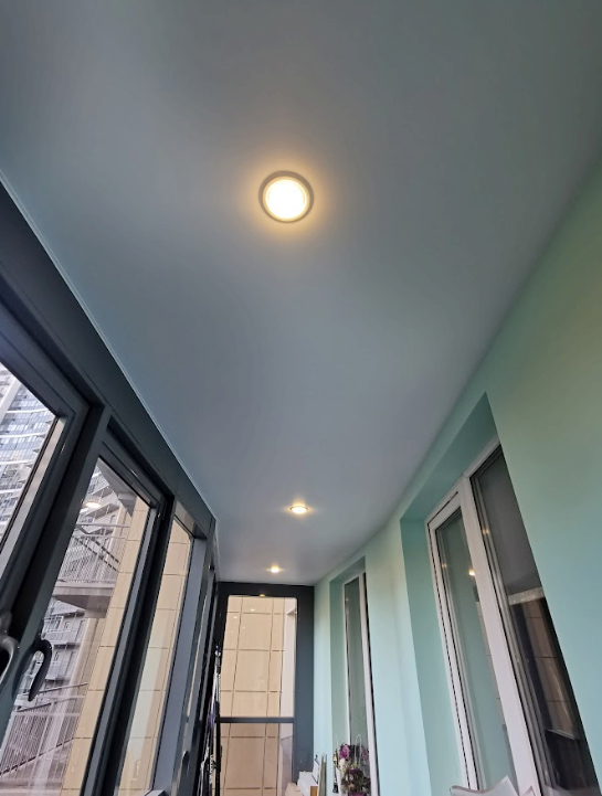 Натяжной потолок не боится перепадов влажности и не накапливает пыль, что особенно важно для открытых и частично утеплённых балконов и лоджий. В потолок легко интегрировать точечные светильники или компактную подсветку — пространство становится светлее и комфортнее в вечернее время.