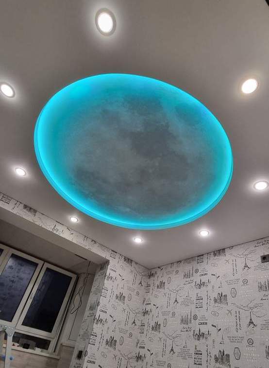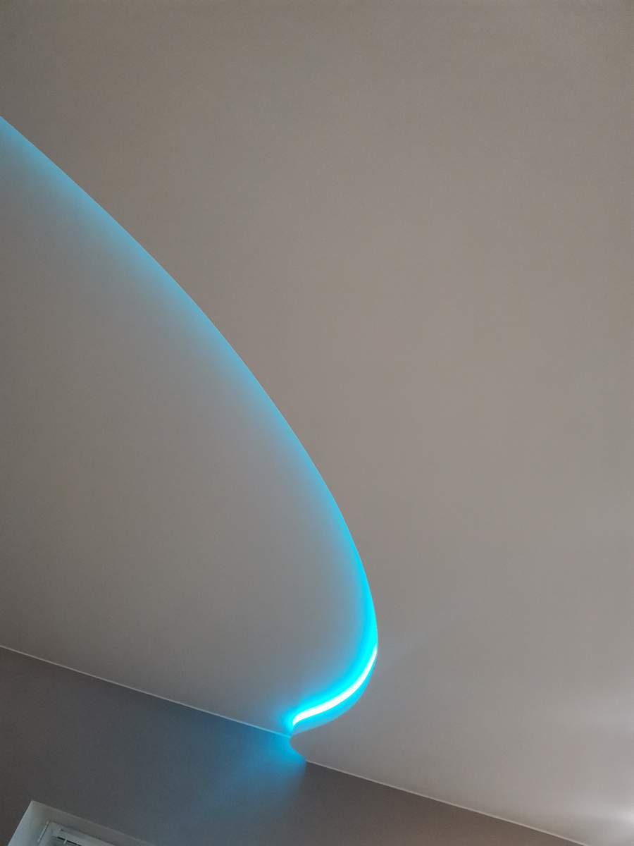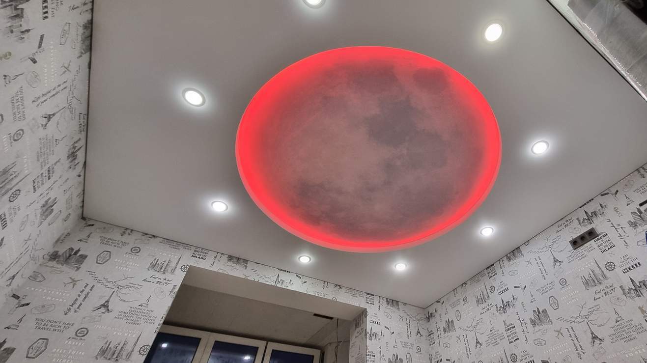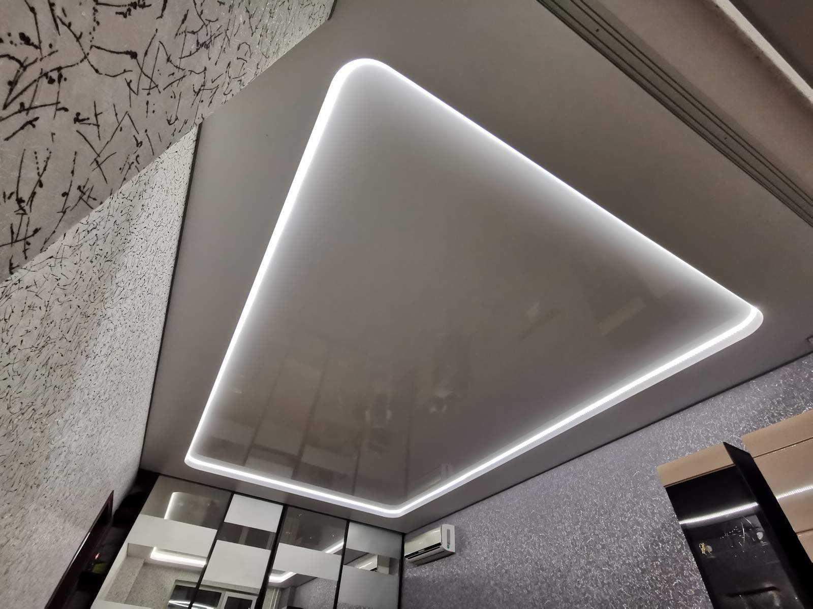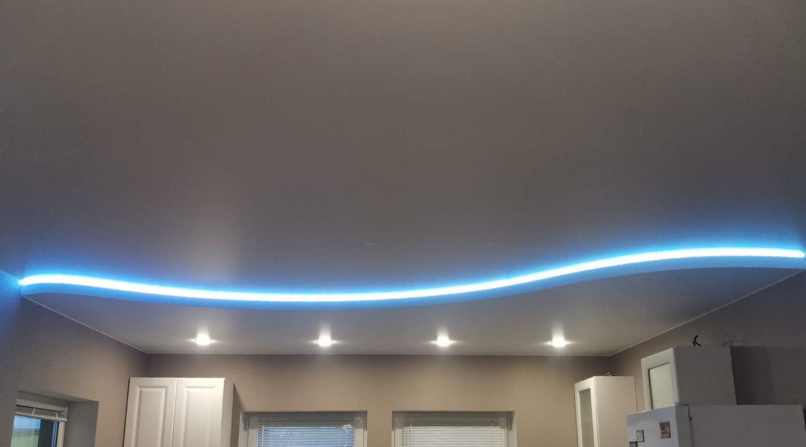 Добавление светодиодной подсветки по периметру придаёт интерьеру глубину и визуальный объём. А если использовать светопрозрачное полотно, потолок сам становится источником мягкого света.